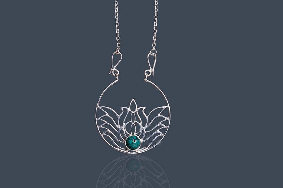 A shining necklace that was created in Indonesia when I returned from India. I was having a peaceful shanti breakfast and got inspired to draw this piece through the images of the beautiful birds of paradise plant that lushly displayed its beauty in front of my dining table. I twisted it into a Lotus mixing the two jungle plants together.